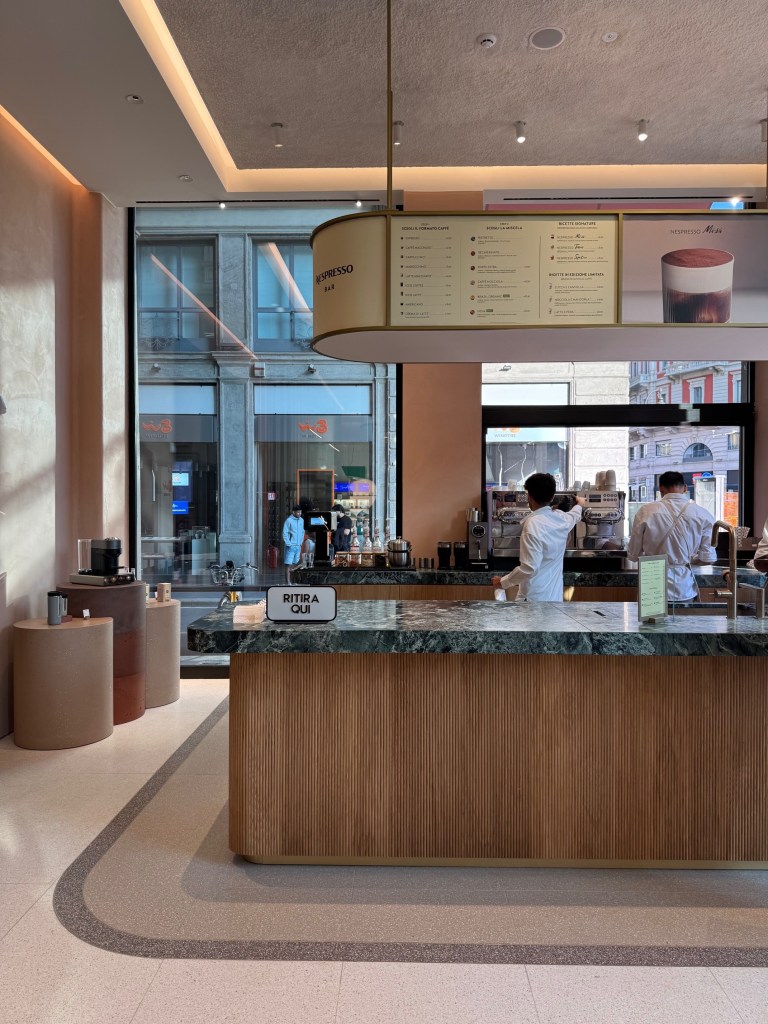 Oltre alla boutique vera e propria in cui acquistare il caffé Nespresso, ma anche regalini interamente personalizzabili, vi accoglierà un bancone centrale stupendo, ideato per ospitare masterclass e laboratori gratuiti per immergersi nel mondo del caffè.